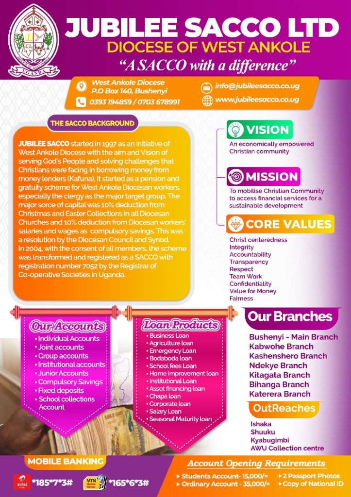 Jubilee Sacco started in 1997 as an initiative of West Ankole Diocese with the aim and vision of serving God’s people, and solve challenges that Christians were encountering in borrowing money from money lenders. (Kafuna)